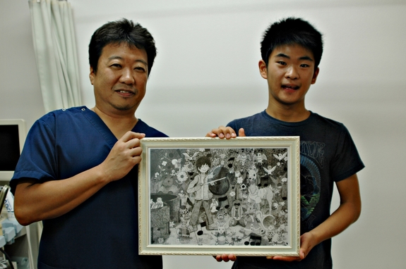 (絵のレンタル契約をしていただいた個人開業医の先生と息子の写真)