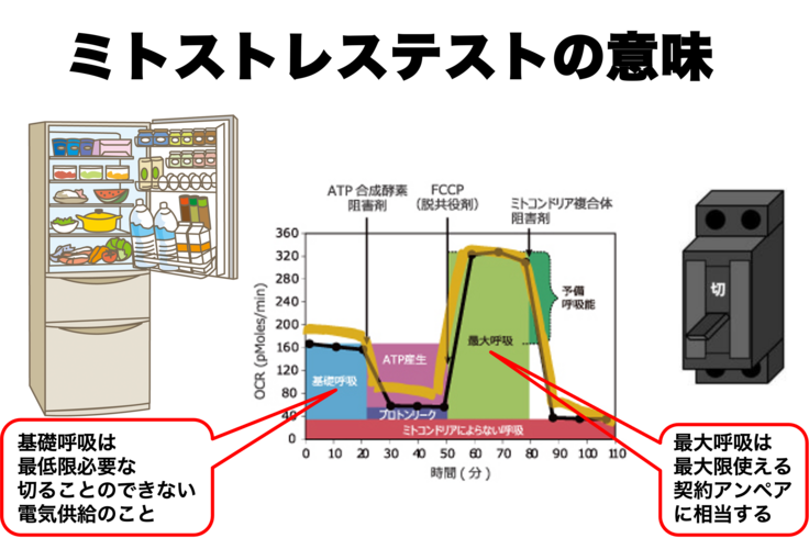 これを使って、ミトストレステストという試験を行うと、細胞の「基礎呼吸」と「最大呼吸」を定量化することができます。下の図をご覧いただき、ミトストレステストを行った際に出てくる典型的な折れ線グラフに注目して下さい。横軸は時間、縦軸は酸素消費速度(OCR: Oxygen consumption rate)です。簡単に家の電気の使い方のたとえで説明すると、「基礎呼吸」は最低限必要な切ることのできない冷蔵庫のような電気供給を指します。「最大呼吸」はどれだけ家電を一度に使うことができるかを示す契約アンペアに相当します。
