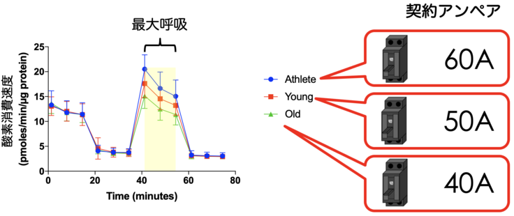 前回の連載記事で、「最大呼吸を日常生活に例えると、家の中でどれだけ家電を一度に使うことができるかを示す契約アンペアに相当します」と言いました。よって、最大呼吸が高いほど、細胞はやりたいことがいろいろできる元気な状態と考えられます。