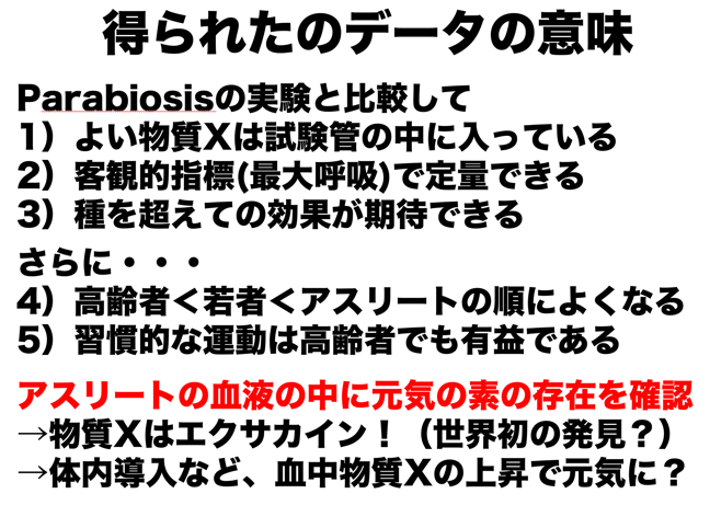 まず今回ヒトの血液サンプルを使った実験をしましたが、1回目で紹介したParabiosis(並体結合)の実験と比較して明らかになったことは、本研究で元気な状態と定義した最大呼吸を高めるのは皮膚接触刺激、体温、フェロモン、気合いなどではなく、試験管の中に入っている物質Xであることです。そして、Parabiosisの実験のように「なんとなく元気になったように見える」というのではなく「元気」を最大呼吸という客観的指標で定量できるようにしました。