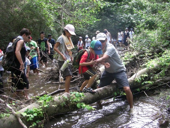 (キャンププログラムの1つ沢歩き、自然の中で子どもたちがのびのびと遊びます。)