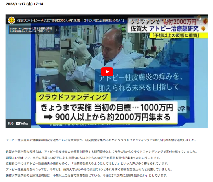 ・佐賀大学アトピー性皮膚炎痒みプロジェクトのホームページにお名前掲載(希望制)