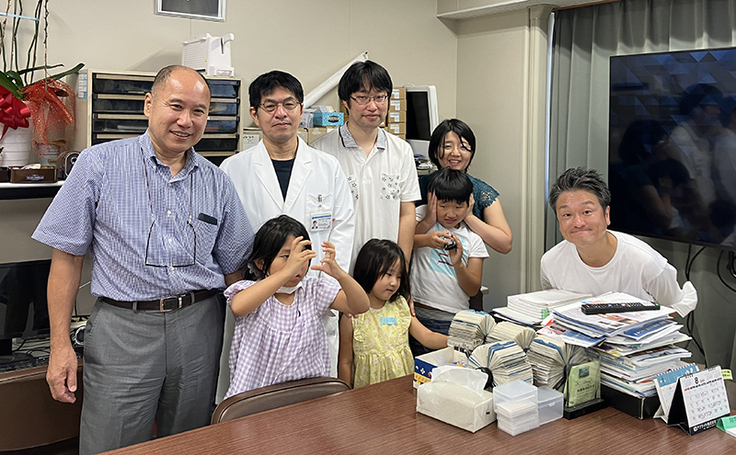 Tさんご一家と研究室スタッフとの写真です。Tさんご一家は、K君(9歳)、Yちゃん(7歳)、Aちゃん(4歳)とそのご両親の全部で5名です。