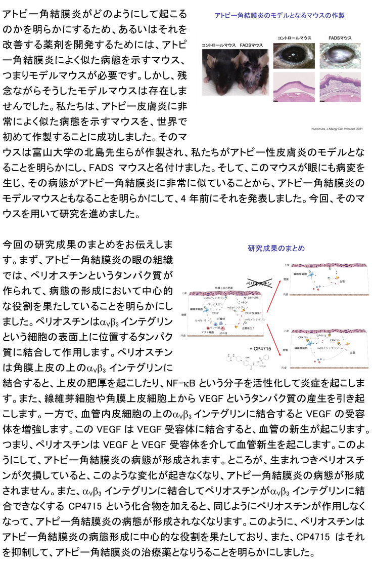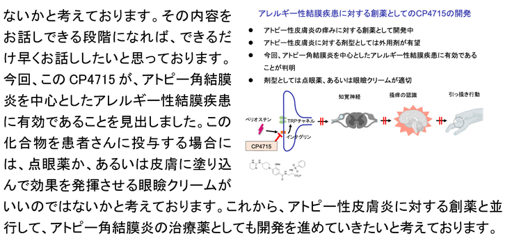 本日、「「CP4715」の慢性のアレルギー性結膜炎への改善効果を発見 -世界初のアレルギー性結膜炎に対する分子治療薬の開発へ-」のタイトルで記者会見を行いました。