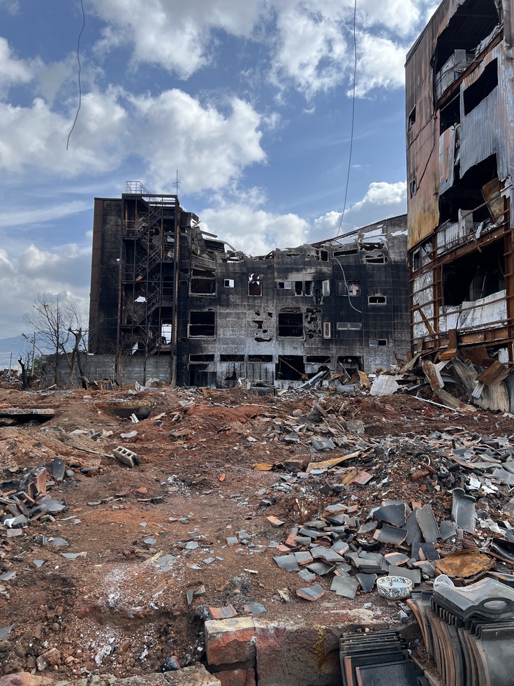 お隣のビルのトタンが風に飛ばされ、我が家の敷地に大量に落ちて来ていて、焼けた現場にほぼ立ち入れない状況が続いていました。