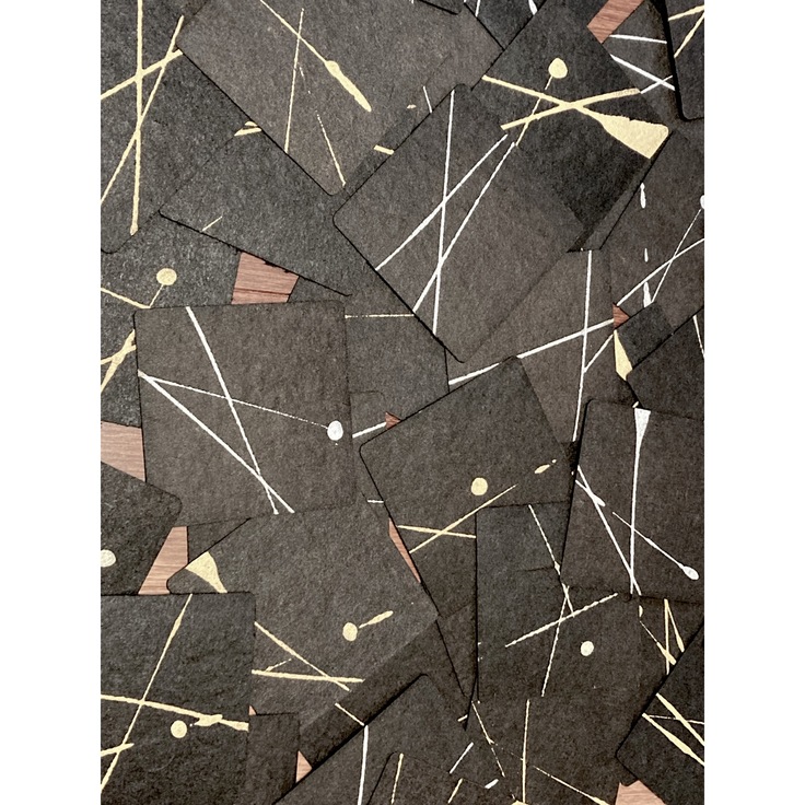 漆地紋様紙、サイズによってコースターやteaマットなどのテーブルウェアは手漉き和紙(能登仁行和紙)に一枚一枚ペイントして、漆を塗って制作しています。全てが異なるデザインで、汚れた場合は食器洗剤を使って水洗いが出来ます。(年単位でご利用頂ける漆地紋様紙は、