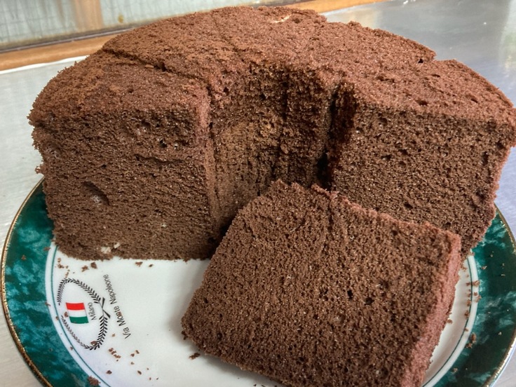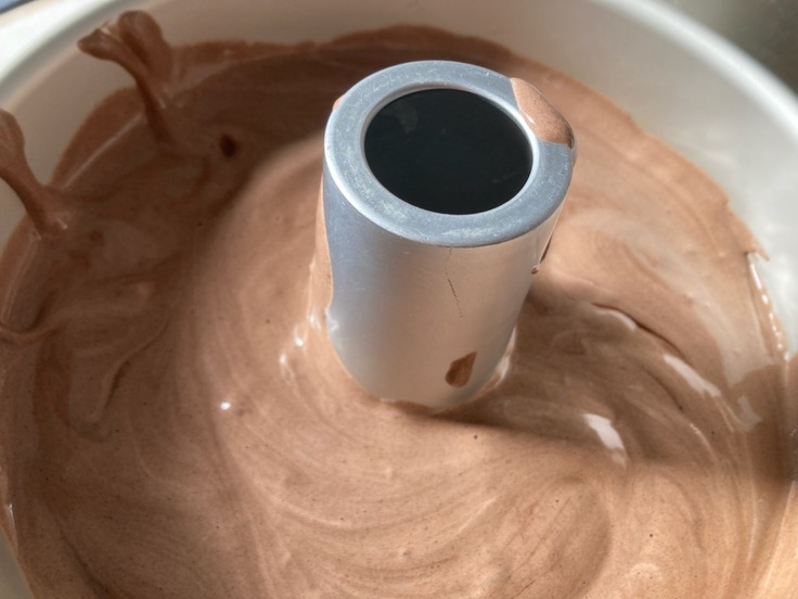 チョコレートシフォンは、メレンゲがつぶれやすいので、生地を揺する程度の空気抜きしか行いません。だから、少し大きめの気泡が。。