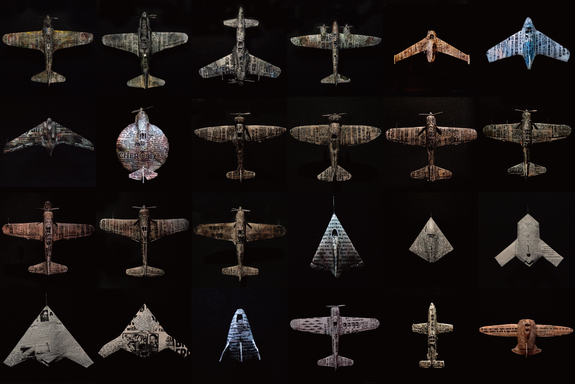 作品サイズは様々ですが主に紙(和紙・ケント紙)などを主な素材とし、その表面にモチーフの時代の新聞・モチーフの背景にある資料などを貼り付けたり、転写したりし、画像のように小さい物は指先に乗るサイズから、実物大の巨大な作品まで制作してきました。