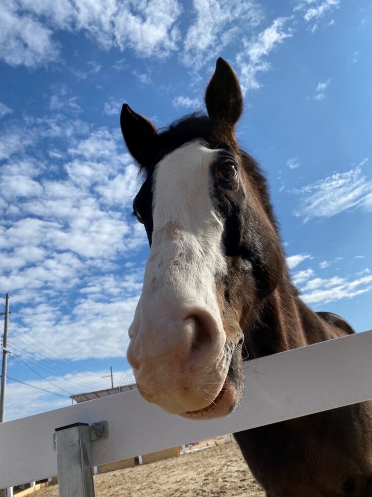 父ホワイトマズル、母トウホーキセキの血統で独特の顔の模様したかわいい騙馬です。まるでエクレアの様な顔をしたズルは、レッスンで頑張ったり、引き馬でお子さんを沢山乗せてくれたりと、オールマイティーな馬です。