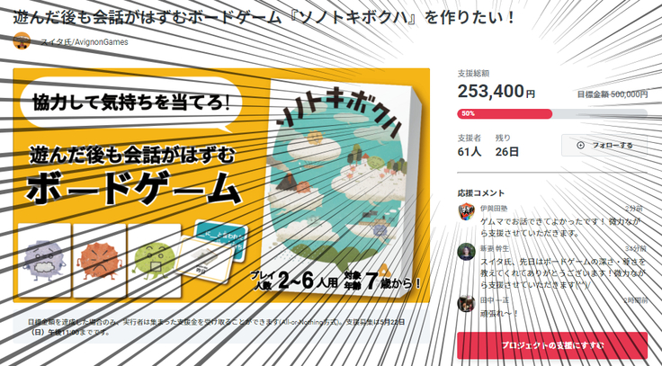 遊んだ後も会話はずむボードゲーム「ソノトキボクハ」制作プロジェクトですが、ついに目標金額達成率を50%を突破いたしました!皆様本当にありがとうございます!