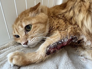 TNR&広報のN田さんが通勤途中で倒れている虎丸を発見。それはそれは酷い状態で毛は抜け落ち、皮膚はズル剥け。保護してすぐに病院へ走り入院治療開始。