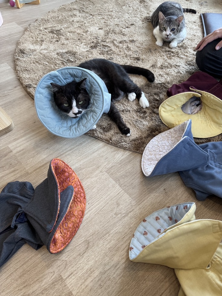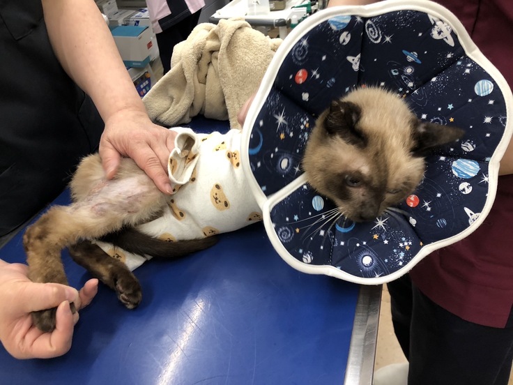 体を舐め壊してしまうため、エリザベスカラーと保護服が必須です。とてもつらい状態です。