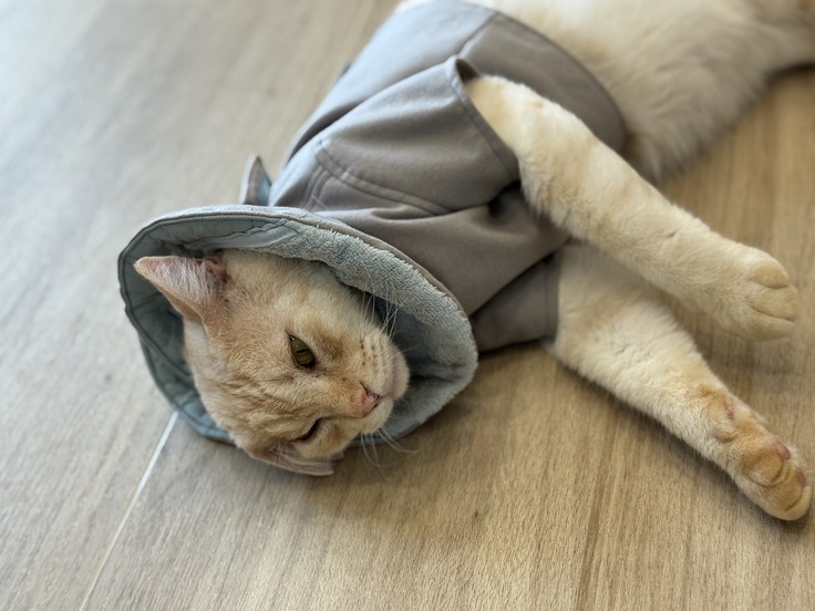 首の負傷により保護されました。傷は一度は治ったものの、傷痕のかゆみから再び掻き壊してしまうため、保護服が欠かせません。猫白血病陽性です。