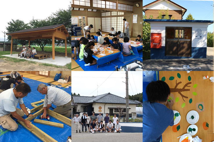 柿原区では2016年から今まで水田の水路整備、道路整備、東屋の設置、集落センターの整備、遊具の設置、ゴミステーションの整備、獣害対策等を行い、私たちは、柿原区のロゴマークデザイン・東屋の設計・東屋のベンチづくりワークショップ・バス停のペイントワークショップなどでお手伝いさせていただきました。