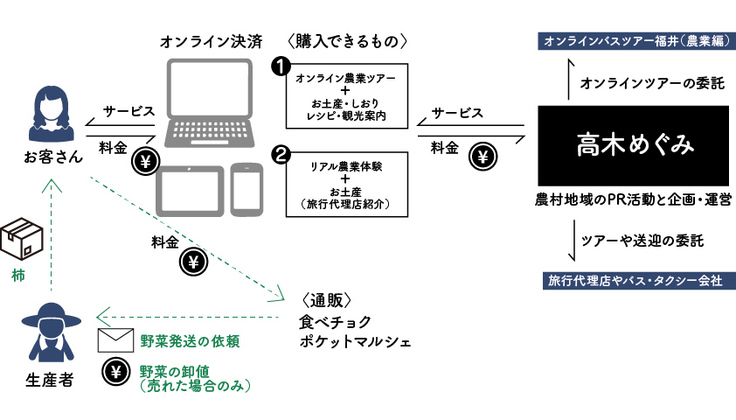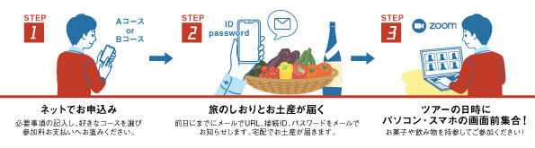 オンラインコミュニケーションツール「Zoom」で農園と参加者をつなぎ、生産者が農園や収穫する柿について参加者へ映像と音声で説明します。途中、オンラインで一緒に作る干し柿づくり体験や柿を使ったレシピ紹介、周辺のおすすめ観光スポットの紹介等をしてツアー終了です。