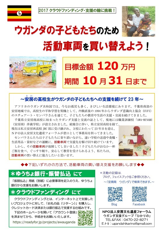 「館山 ウガンダ支援へ120万円募る 10月末までに車購入資金」