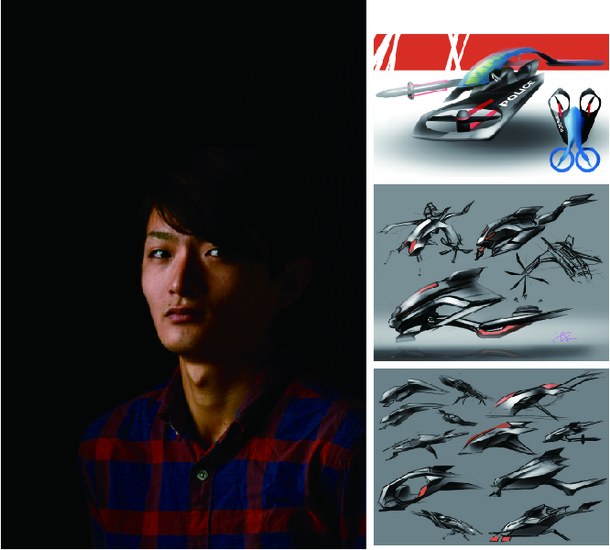 飯干勝士 / 大学の1年時から乗り物のデザインに興味を持ち、二輪や四輪のデザインを行ってきた。右は卒業制作のスケッチであり、2030年における警察車両を考えている。