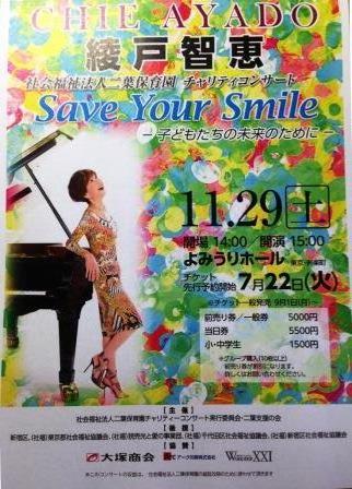 チラシ、ポスターの背景にある水玉模様は、児童養護施設二葉学園(http://www.futaba-yuka.or.jp/int_gak/index.html )の子どもたちみんなが参加して指のシルエットを押して作ってくれました。とても温かな背景に仕上がっています。その前に綾戸さんらしい写真が浮かび上がっていて、コンサート当日の風景が呼びさまされるようでしょう?全体のデザインは二葉学園の職員がデザインしてくれました。