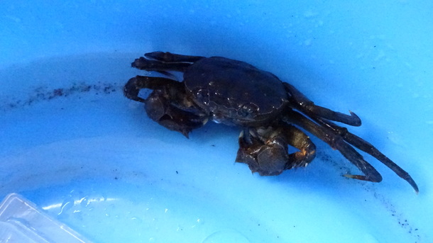 子どもたちには、モクズガニやテナガエビなどの観察したり触ったりしてもらいました。