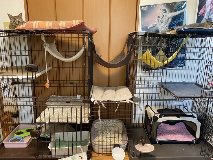 今日は、同じ部屋のケージに隔離です。抗がん剤を打って24時間以内の排泄物には、発癌物質が含まれているそうなので、私も取り扱いに気をつけます。