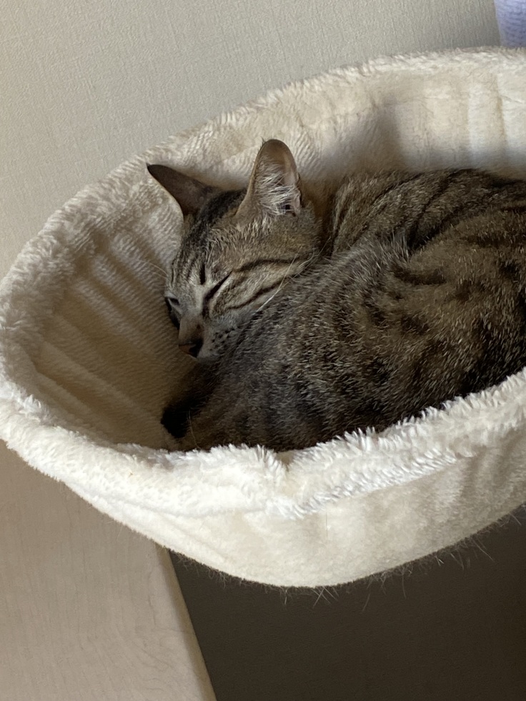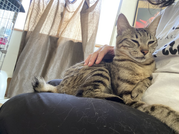 調子が悪い時には、自分から膝の上には乗りません。11時30分に、ようやく、キャットタワーから降りて、膝の上でゴロゴロ。少し、よくなってきたかな。