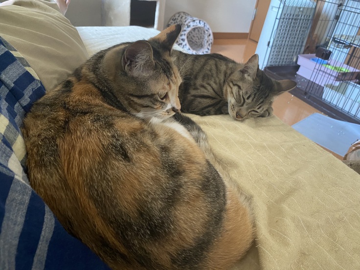 ここちゃん、朝ごはんはもりもり食べていたので安心したけれど、リンパクトデリタブを乗せたところの一帯は残しました。よけたのに食べなかったから、少し気になっていましたが、やはりまだ副作用は続いているのかなという感じです。前は、ご飯を食べなくてもリンパクトデリタブは好んで食べていたから、2時ぐらいに差し出してみたら、それだけで、オェッて、吐きそうになってました。気持ちが悪いのですね、きっと。見守りカメラで確認すると、カリカリも食べていないかったようです。午後は、ずっとそばにいました。私の上に連れてきても、少しすると降りてしまいます。具合が良くない時の傾向です。夕飯、食べられるかな。早く楽になればいいね、ここちゃん。