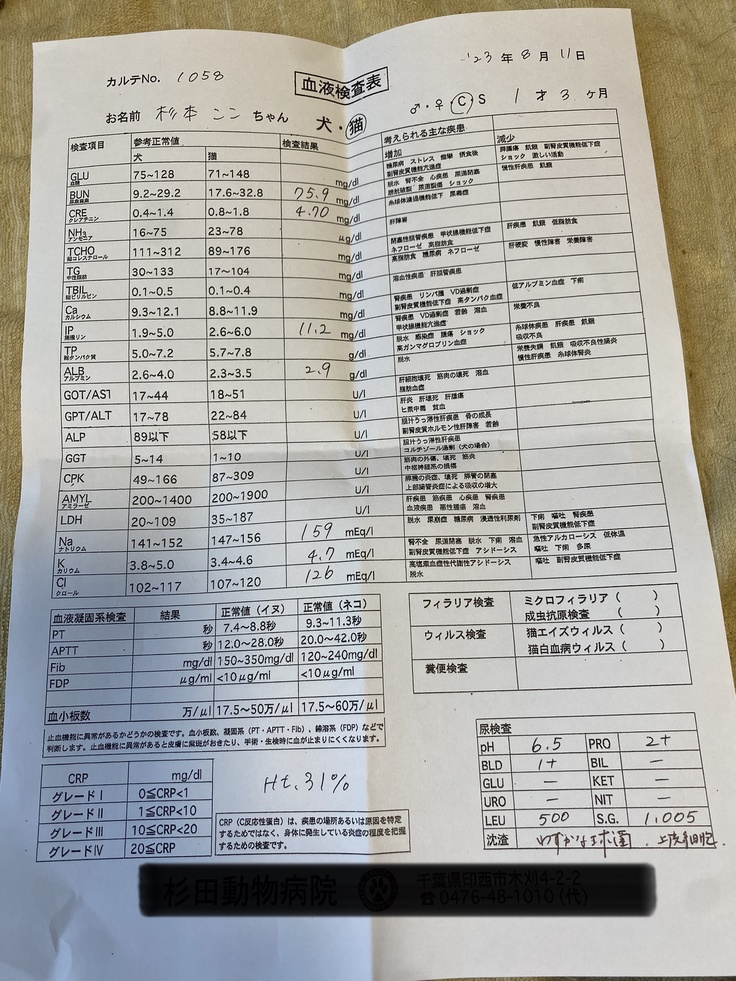 腎臓の状態を見る指標になるBUNは、75.9に上がってしまいました。でも、クレアチニン(炎症値)は、下がりました。BUNよりもクレアチニンを気にしなければならないので、これは嬉しいことです。他にも、よくなったり、悪くなったりが見られ、まだまだ、深刻な状態に変わりありません。