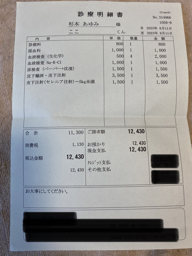 今日の病院代です。↓これが毎日続くと思うと、正直厳しい、、、9匹の餌や砂代+地域猫の餌代もあるので。皆様からご支援いただいたお金をいただけるのは、11月なのです。ここちゃん、がんばって早く復活してね!