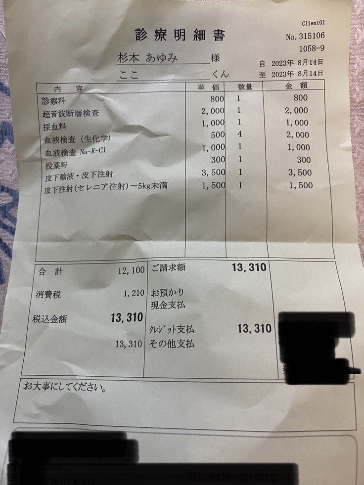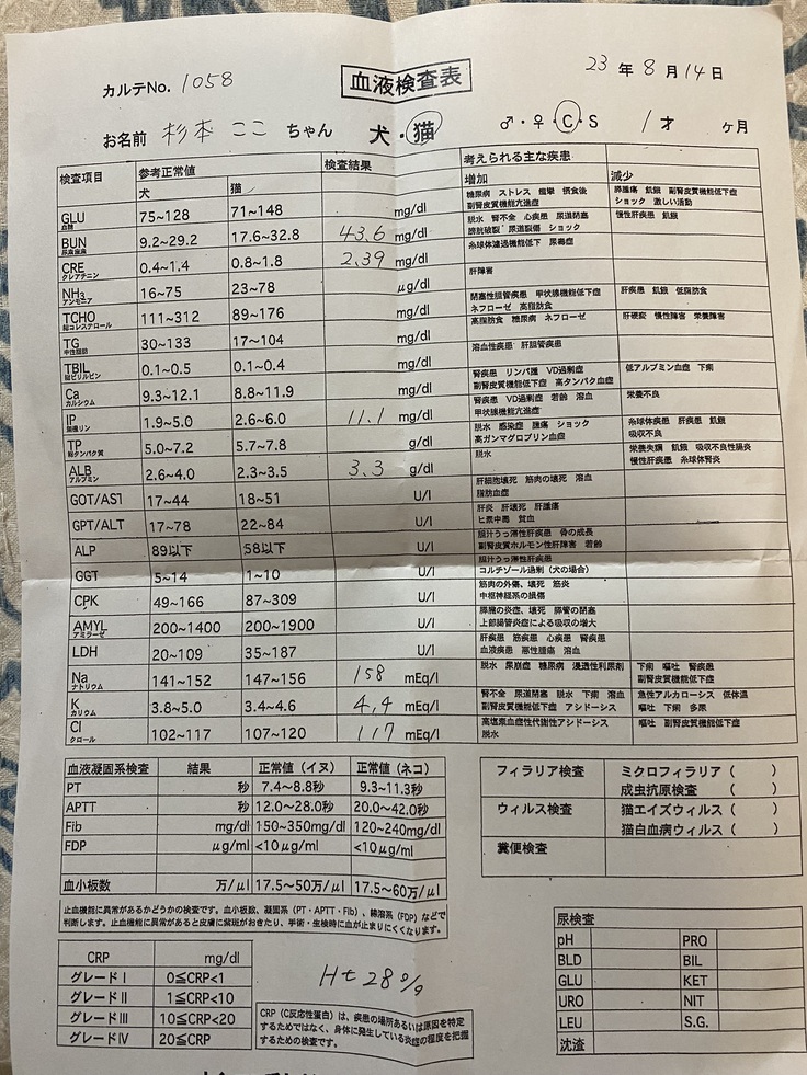 腎臓の数値は、また改善されていました!今日は、エコーでお腹の中や、胸を見てくださりましたが、リンパ腫らしきものはないということでした!そして、腎臓の大きさは、小さくなっていました!3.5→4.2→、、、今日は、3.6cmでした!リンパ腫の転移の可能性は、減りました!やはり、シクロホスファミドを投与した後、おしっこを我慢してしまって膀胱炎になり、腎臓に炎症が及んでしまったのかもしれないなと、申し訳なく思います。とにかく、早く治ってほしいです。このまま慢性腎不全に移行してしまいませんように。今日まで毎日点滴をしていましたが、これから一日おきになります。水、金に点滴をし、土曜日に、血液検査と尿検査をします。多分、土曜日の抗がん剤治療は、延期になるでしょうということです。