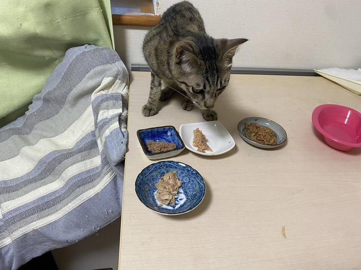 朝ごはん、焼きがつお、ad缶、モンプチを2サイクルして与えました。ちょっと食べて、食べなくなったら、次、次という感じです。よく食べているように見えますが、消しゴムの削りかすぐらいの小さい物をたくさん咀嚼していて、量としては、とても少ないです。でも、食べてくれると、ひとまずほっとします。夜中も、日中も、見守りカメラでしょっちゅうチェックしていますが、トイレは3時間おきぐらい、水はトイレの後にという感じで、兄弟たちとなかよく、ずっと寝ています。