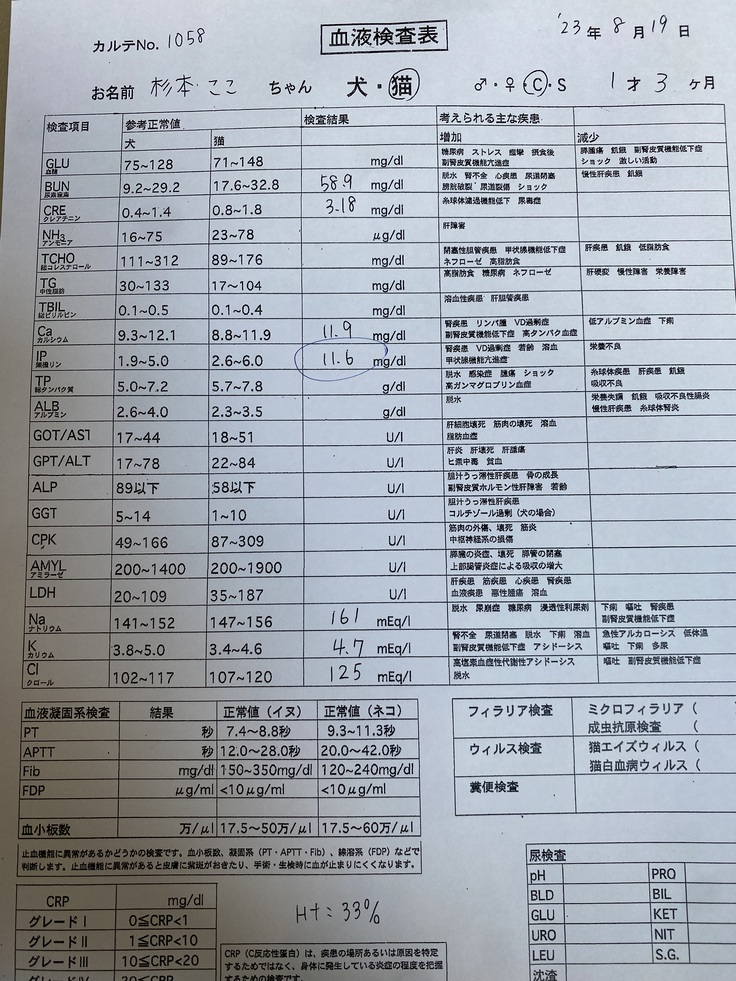 残念です。14日よりも腎臓の数値が悪化していました。何かしらの原因で、急性腎炎になったのならばどんどん良くなるはずで、8/10に腎臓の数値がが突然悪くなってから、血液検査をする度に良くなってきていたので、今日も改善していると思っていました。先生の説明でも、今日の数値が良くなっていたら、皮下点滴をやめて一週間後に検査して、悪化していなければ、急性腎盂腎炎とかということでしょうと、説明を受けていました。でも、悪化してしまいました。8/5に、シクロホスファミドを投与する前の腎臓の数値は、なんの問題もなく、8/6から具合悪くなってきたことを考えると、やはり、おしっこを我慢させてしまったことが原因だと考えてしまいます。先生は、関係ないと断言はできないけれど、違うとは思うとおっしゃっていましたが、私は、後悔しかありません。一般的には、抗がん剤治療をすると、白血球や好中球が減るということが起きて治療中断となりますが、予想される副作用と全然違う方向からの出来事だとおっしゃっていました。これからは、慢性腎不全の治療をすることになります。二日に一度、自宅で皮下点滴とステロイドの注射をします。(ステロイドを飲むのを嫌がるので)ただ、ここちゃんは、病院でも嫌がり方が半端なかったらしいので、できるかどうか。できなかったら、その日の夕方、病院でやってもらうことになりました。リンの数値も上がっているので、リンを吸着させてうんちと一緒に出すサプリも毎日、水に溶かして飲ませることになりましたが、これもかなり嫌がるようで、飲んでくれたらよいのですが。飲まないと、悪化してしまうので。