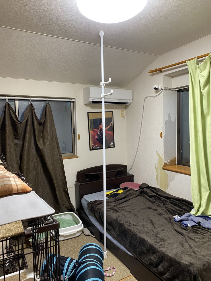 天井から床までの、突っ張り棒の帽子かけ。帽子をかけるところに点滴をぶら下げます。いつものように私がソファに座りながらここちゃんをだっこ。作戦成功。ここちゃん、落ち着いて点滴を受けてくれています。ただ、一昨日、加圧ポンプの音を怖がって逃げたので、今日は、ポンプをシュッシュッとやる時に、夫がここちゃんの耳をパタッとふさぐことにしました。大成功!無事に終わりました。