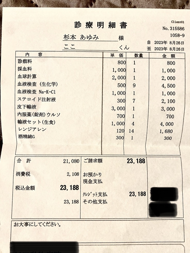 腎臓の数値(BUN、クレアチニン)は少しだけ下がっていましたが、やはり、慢性腎不全だという診断を受けました。残念ながら、抗がん剤治療、不適合となります。これからは、慢性腎不全に対する治療を続けながら、リンパ腫が再燃していないかを見ていくことになります。今は、完全寛解していますが、いずれ再燃するとのことです。そうなった時に、どうするのかを相談していかなければならないと主治医から話がありました。Lアスパラギナーゼを投与したら腫瘍は小さくなるだろうからそれで様子を見て、また腫瘍が大きくなったら、Lアスパラギナーゼを投与。でも、3回投与したら効果がなくなるようです。そうなったらどうするのか。