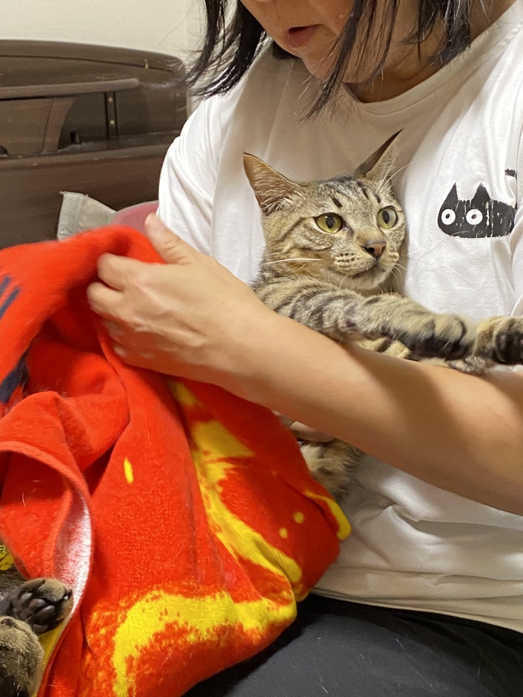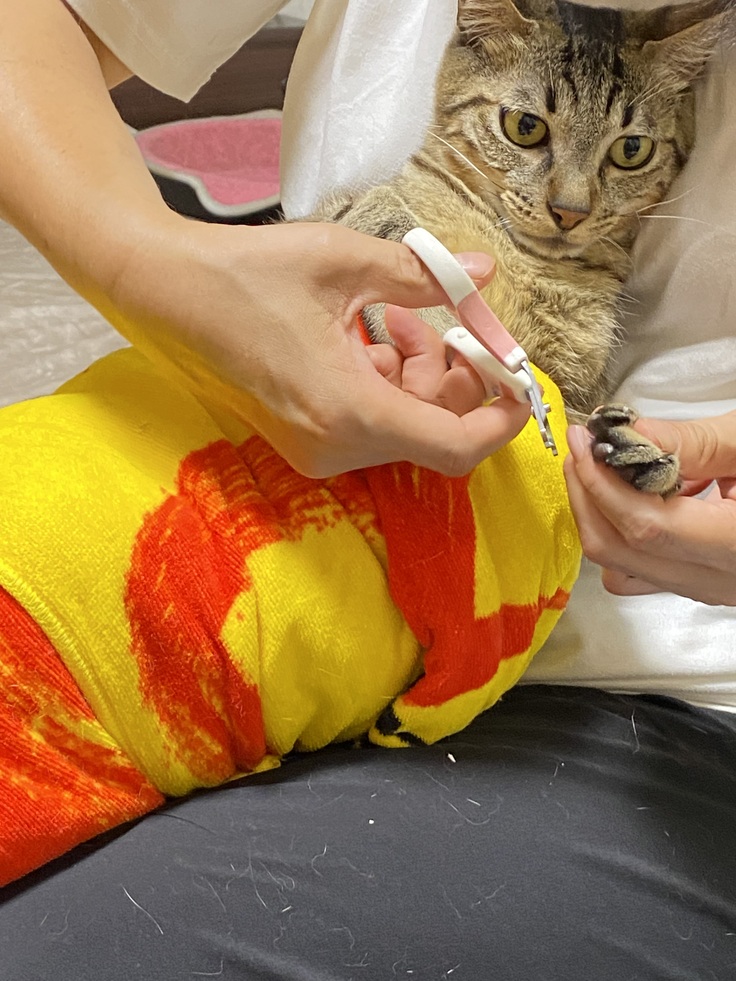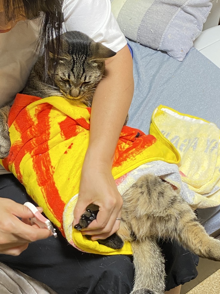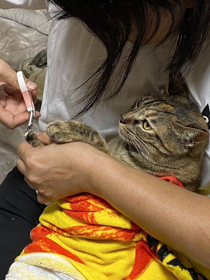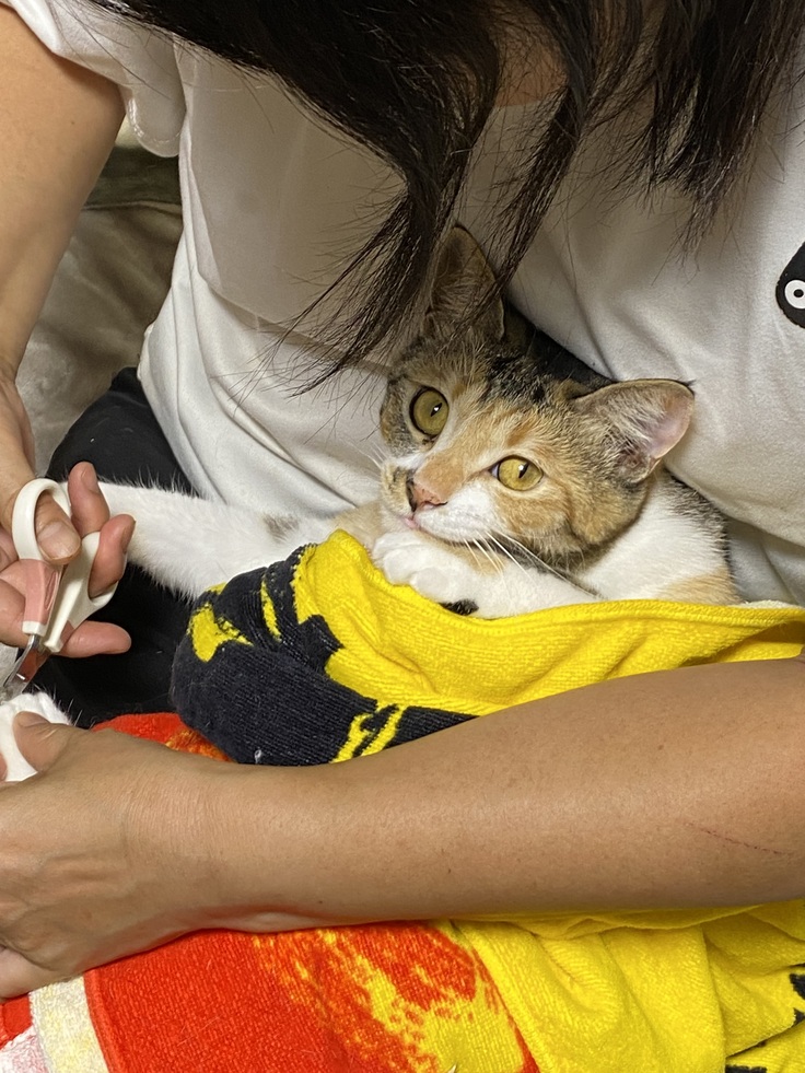 最後は、ここちゃん。包まれる時から助けてーというポーズ。切る時も、いちいち、びくびくするのでこっちもビクッとします。ビビりちゃんなのです。