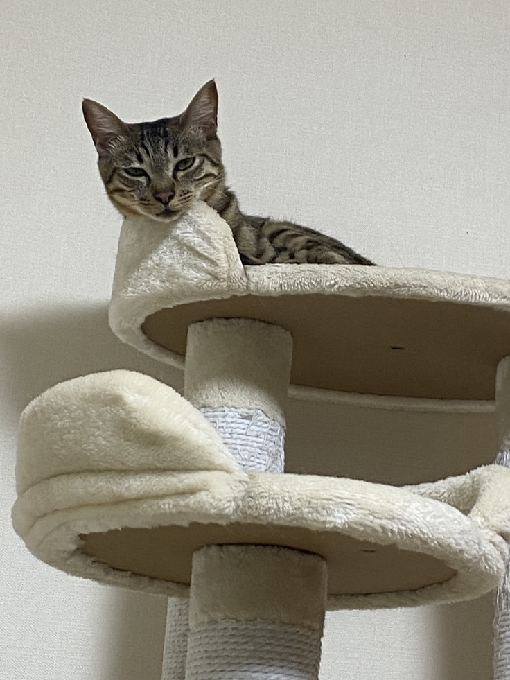 視線を感じて振り向くと、キャットタワー最上級から、眠そうに私を見ていました。