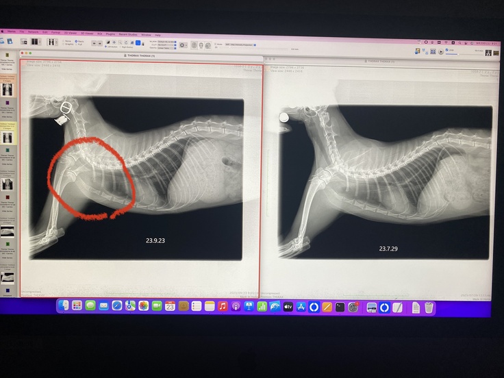 右が7月のレントゲン。左が今回です。まるで囲んだところに塊が見えます。