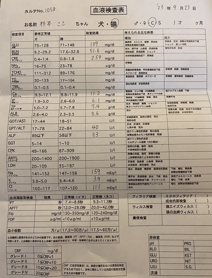 9月9日の診察のときは異常なかったので、そこからできてしまったようです。ステロイドを飲んでいるので進行は抑えられていたようですが、何もしなければ大きくはなっていきます。Lアスパラギナーゼを投与したら、腎臓に負担がないとは言えない、、、。Lアスパラギナーゼは、腎臓に副作用が大きく出るものではないけれども、急性で腎臓の機能が壊れてしまったここちゃんなので、何が起こるかはわからないとのことでした。血液検査をして調べて、どうするか決めることになりました。