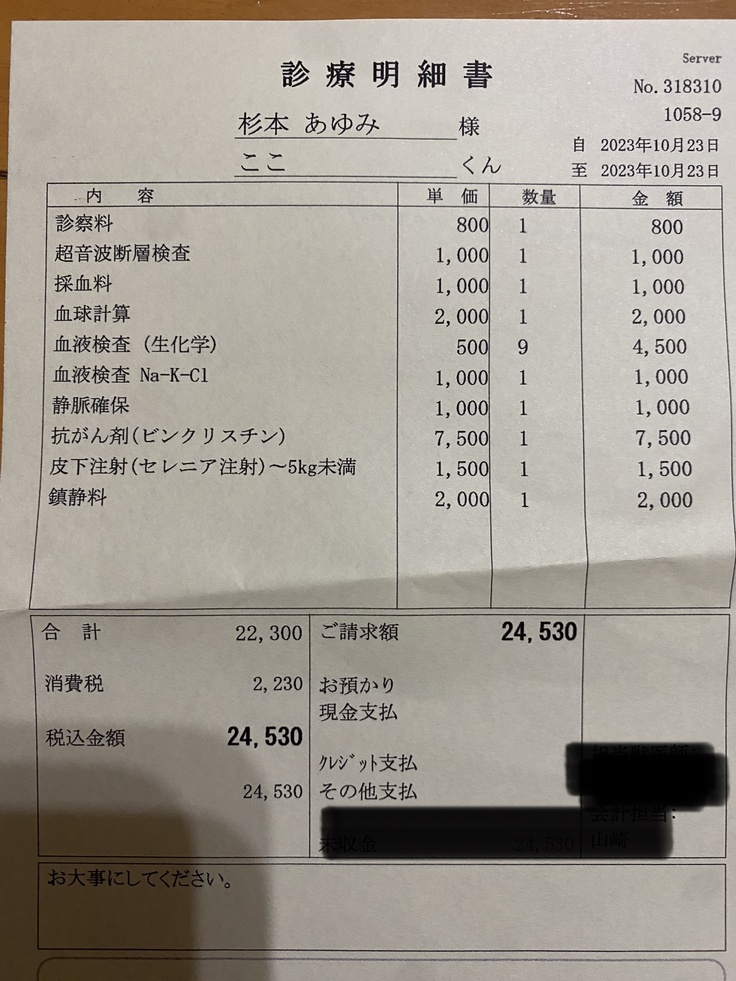 が、ここから予想外なことが!先週、担当医に、ピンクリスチンを投与できないかと提案しましたが、デメリットしかないからと止められました。しかし、院内で話し合ったり、調べたりしてくださったということで、ピンクリスチンを打ってみるのもあり、他にもいくつか、レスキュー抗がん剤はある、リスクを覚悟し、あとは、飼い主次第、と説明してくださいました。私は、やりることに決めました。