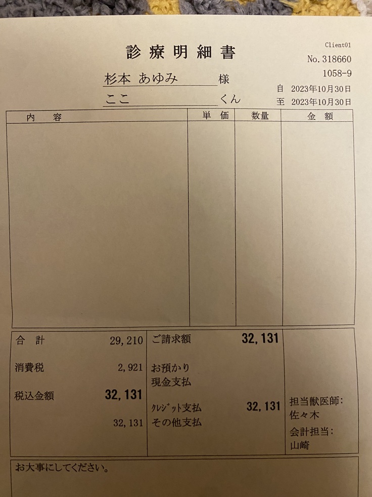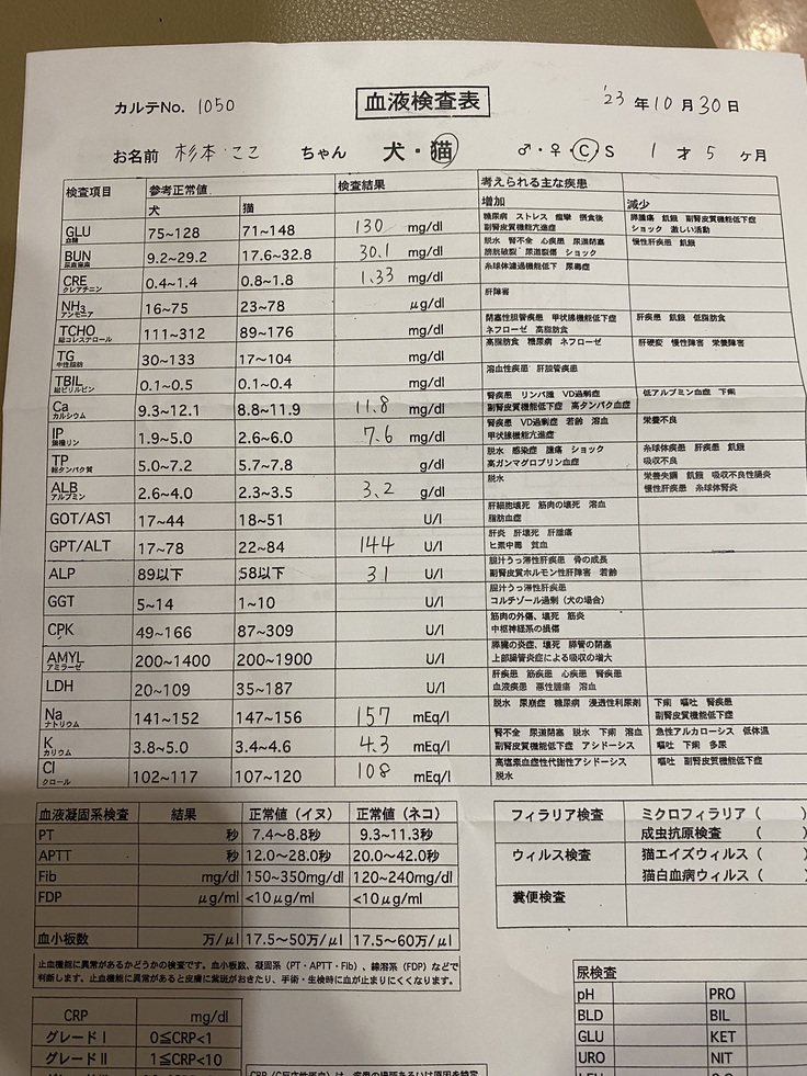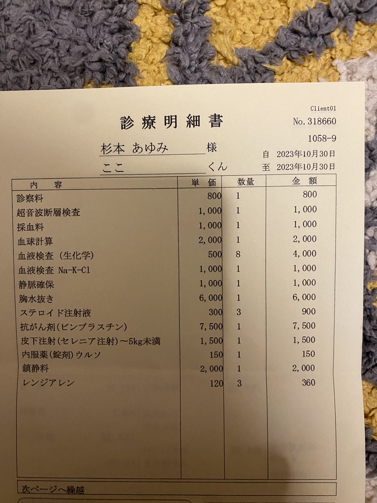 夕方迎えに行き、担当医の話を聞きました。胸水は、胸の中で動いてしまい、12mlぐらいしか抜けなかったようです。あと、20.30mlはあるそうです。抗がん剤は投与。でも、ここちゃんは、元気そうでした。