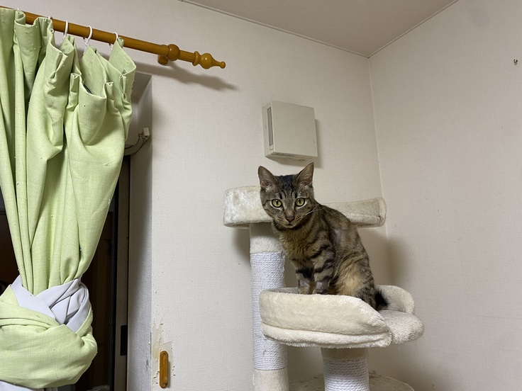 しかし、今朝、兄弟たちが第二ねこ部屋に行った後ろ姿を見て、ついて行きたそうな様子が!開けてあげるとすぐにトンネルをくぐって行きました。戻れたかなと気になっていましたが、見守りカメラを見ると、そのまま、第一ねこ部屋に戻れなかったことがわかりました。帰りたくて、トンネルの前には行くのですが、触れない、、、兄弟たちが目の前でくぐっていても続くことができない、、、。トイレ入れてあったのでよかったですが、水や餌はありません。結局、19時半頃、私がトンネルの扉を開けてあげて戻れました。早く覚えてくれるといいなあ。