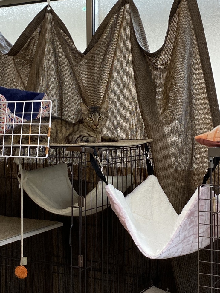 朝からずっと寝ていて、トイレも水飲みもしてないけれど大丈夫なのかな、でも、兄弟たちも同じだから大丈夫なのかなと気にしていた時、むくっと起き上がり、ケージから飛び降りトイレに直行。昨日買ったトイレに入り、サイズ感を間違え、お尻が出たままおしっこ。わあああ‼️という感じですが、してくれたことが嬉しい。その後、水をゴクゴク飲んで,少し歩いて,元いたケージの上に戻りました。寝ています。
