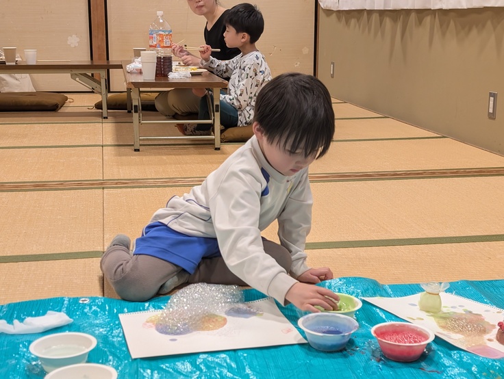 今回は、バブルアートをやりました。みんな夢中になってやっていました。