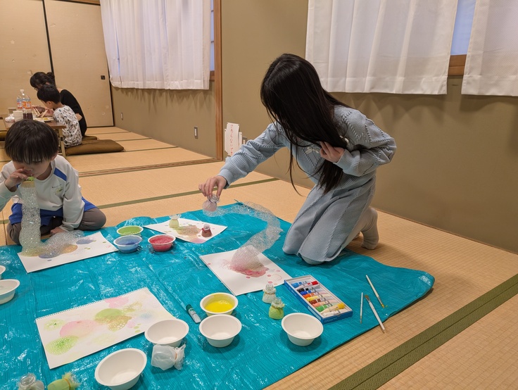 前回のこども食堂のレクリエーションでは、バブルアートをしました。