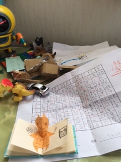「子ども未来塾」で子ども達と一緒に作った作品や課題のプリントがどんどんたまります。