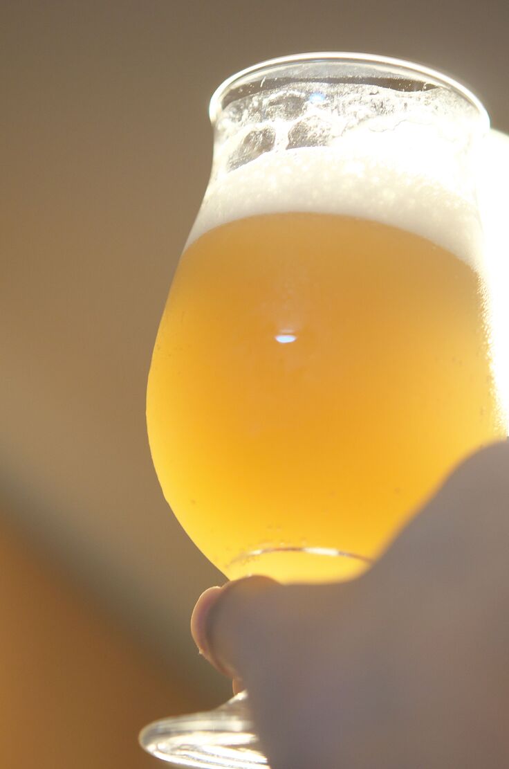 室内の写真ですが、光にかざしてみました。アザレアエールの色はこんな感じです。
