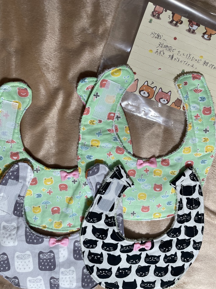 先日、母から連絡もらっていたよだれ掛けが速達で送られてきました。