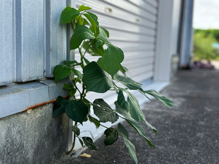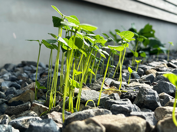 かごしまんまの敷地内には、選別時などに小豆がこぼれて落ちてました。それらが土の中からではなく、なんと砂利やコンクリートの隙間からでも、芽吹いて成長しています。