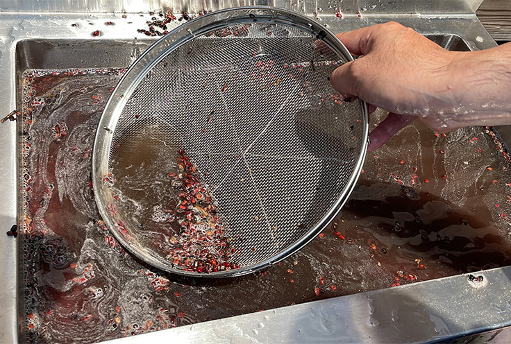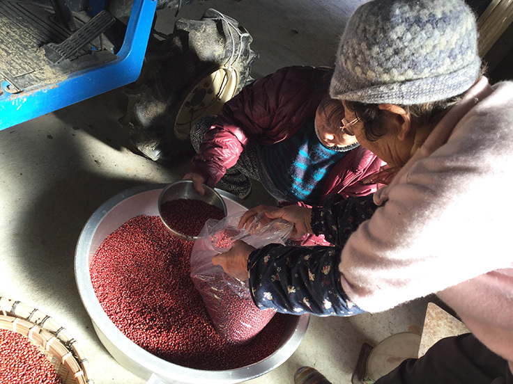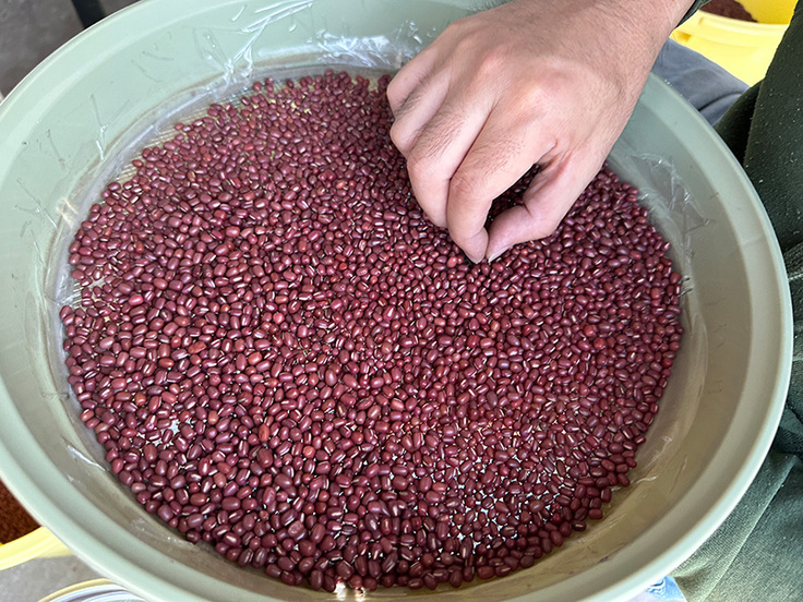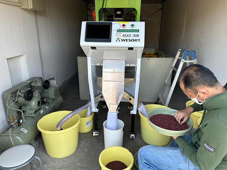 収穫後に水洗いして乾燥させた小豆は、ザルで粒径選別した後に色彩選別機に5,6回かけてから、最後に人の目で選別します。この人の目での選別作業は非常に手間と時間がかかり、2人がかりでやっても1日に10kg弱しか選別できません。