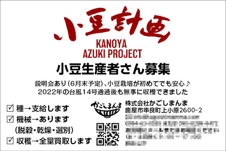 かごしまんま商品の中でも、肝付町の山あいの農家さんから直接仕入れる地小豆は、毎年完売する人気商品でした。通常の小豆よりかなり小粒ながらも、非常に美味しい小豆だと評判でした。
