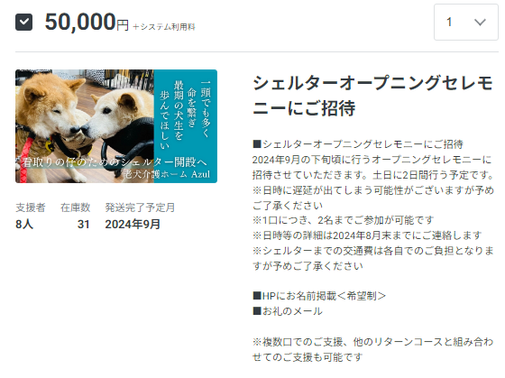 このプロジェクトが成功し、より一層強く喜びを分かち合えたらと、シェルターオープニングセレモニーにご招待のリターンもございます。